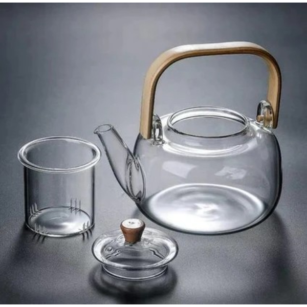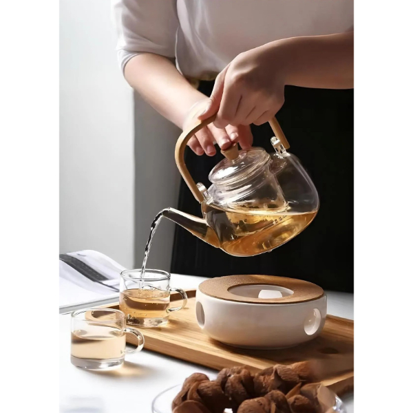 Ahşap Saplı Cam Filtreli Demlik, ısıya dayanıklı borosilikat camdan üretilmiştir. Cam süzgeç içerdiği için çay yaprakları veya bitkiler süzülerek servis edilir. Ahşap saplı ergonomik tasarımı sayesinde kullanım kolaylığı sunar. Kapak kısmındaki ahşap detaylı cam düğme, estetik bir dokunuş sağlar. Şeffaf tasarımı, çayın demlenme sürecini gözlemlemeye olanak tanır. Bitki çayları, siyah çay ve yeşil çay demlemek için uygundur. Ayrıca kahve ve sıcak içecek servisi için de kullanılabilir. Modern ve minimalist tasarımıyla mutfak dekorasyonuna şıklık katar.