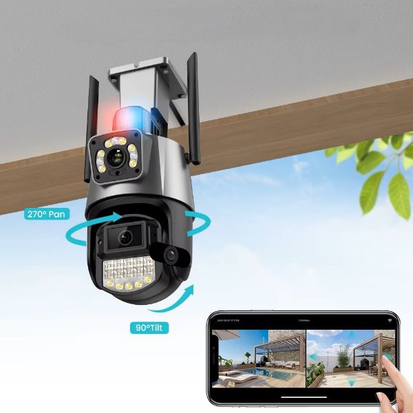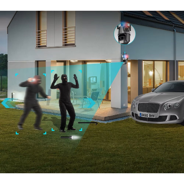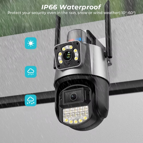 Çakarlı çift lensli dış mekan güvenlik kamerası, yüksek çözünürlüklü 8MP görüntü kalitesiyle profesyonel güvenlik çözümleri sunar. Çift lens tasarımı sayesinde geniş açılı ve detaylı görüntü sağlar. Gece görüş özelliği ile düşük ışıkta bile net kayıt yapabilir ve tam renkli gece görüntüleme desteğiyle güvenliği en üst seviyeye taşır. Çakarlı alarm özelliği sayesinde şüpheli durumlarda görsel ve işitsel uyarı verir. Çift yönlü ses desteği sayesinde kamera üzerinden karşılıklı iletişim kurulabilir. IP66 su geçirmezlik standardına sahip olan kamera, yağmur, kar ve toz gibi zorlu hava koşullarında sorunsuz çalışır. Hareket algılama özelliği ile anında mobil cihazlara bildirim gönderir ve Bluetooth desteğiyle hızlı bağlantı imkânı sunar. PTZ kontrol desteği sayesinde 355° yatay ve 90° dikey açıyla çevreyi eksiksiz izleyebilirsiniz.