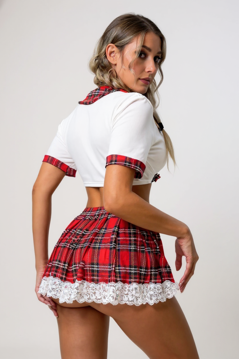 Kadın Beyaz Dantelli Ekoseli Etek ve Büstiyerli Tanga Külotlu Liseli Kostümü – Modern ve Şık Tasarım