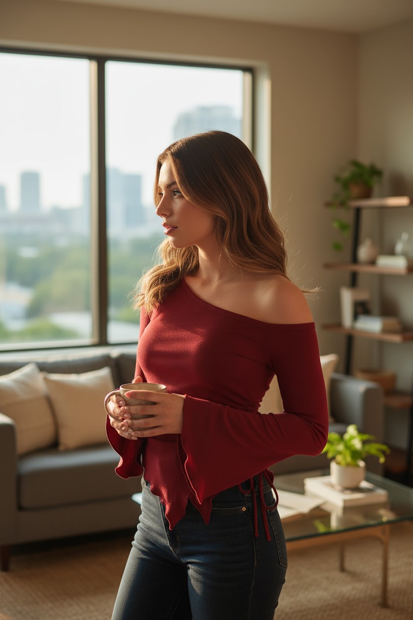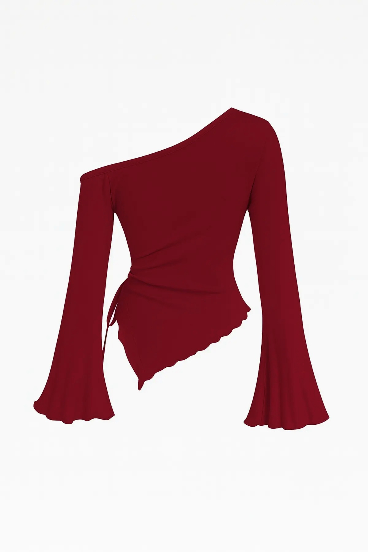 Kadın Bordo Uzun İspanyol Kollu Asimetirik Yaka Yandan Bağlamalı Drapeli Bluz