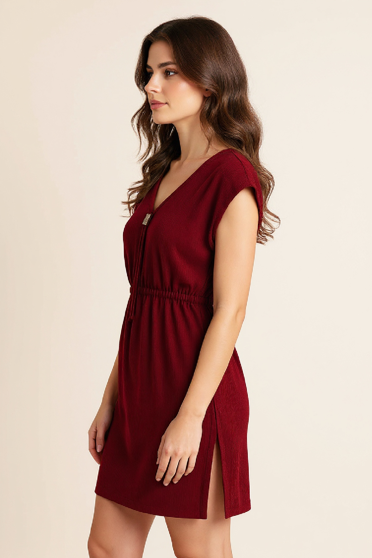 Kadın Bordo Yanları Yırtmaçlı Tokalı V Yaka Mini Plaj Elbisesi