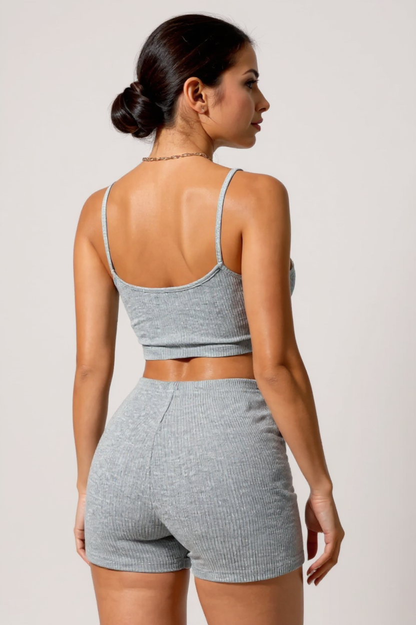 Kadın Gri Melanj Şortlu Kaşkorse Gecelik Takım – Modern, Konforlu ve Günlük Kombinlere Uygun