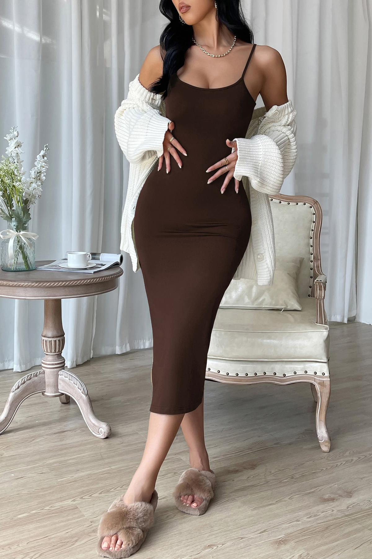 Kadın Kahverengi Yırtmaçlı Diz Altı Vücüdu Saran Gecelik – Modern ve Şık Tasarım