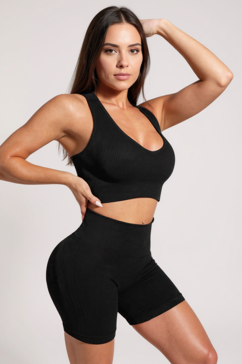 Kadın Siyah Yüksek Bel Çapraz Sırt Detaylı Şortlu Gecelik Takım – Modern, Konforlu ve Günlük Kombinlere Uygun